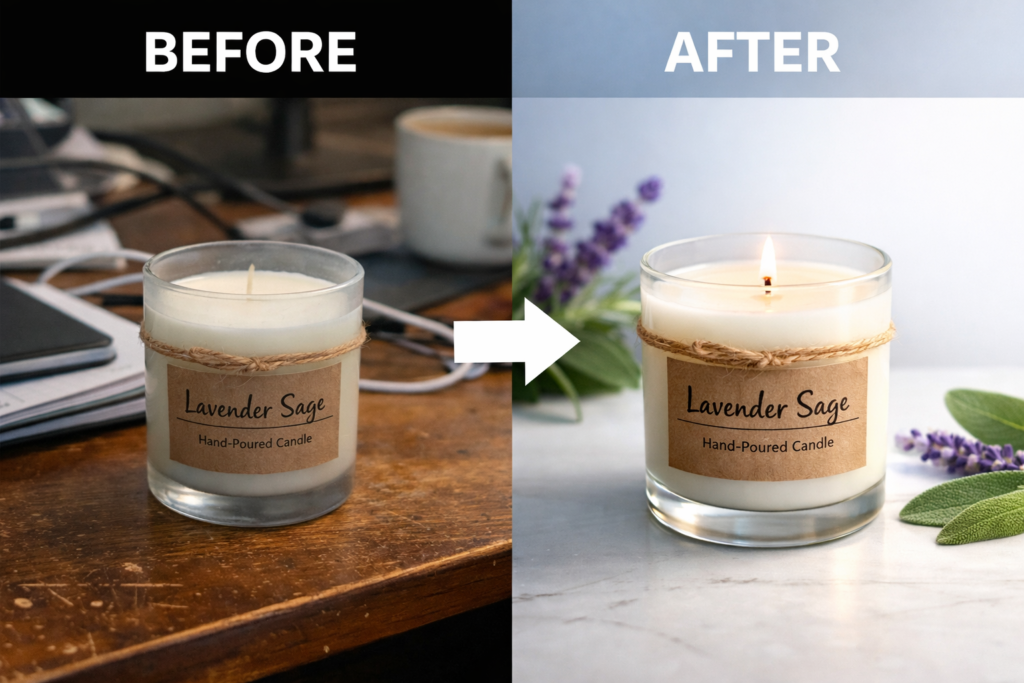 Upload a flat, poorly lit smartphone photo—for example, a handmade candle sitting on your desk. Photoshoot automatically corrects shadows, balances exposure, enhances highlights, and simulates professional studio lighting.